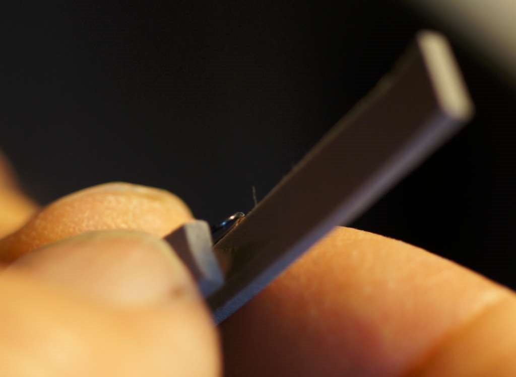 Incollare con Attack gel le due parti piatte (sopra e sotto dell’amo) comprendendo dentro l’amo stesso