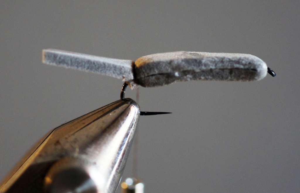 poi forarlo in asse facendo in modo che il foro sia a circa 1/3 della striscetta per la parte sotto del corpo e 2/3 della stessa per il dorso dell’artificiale