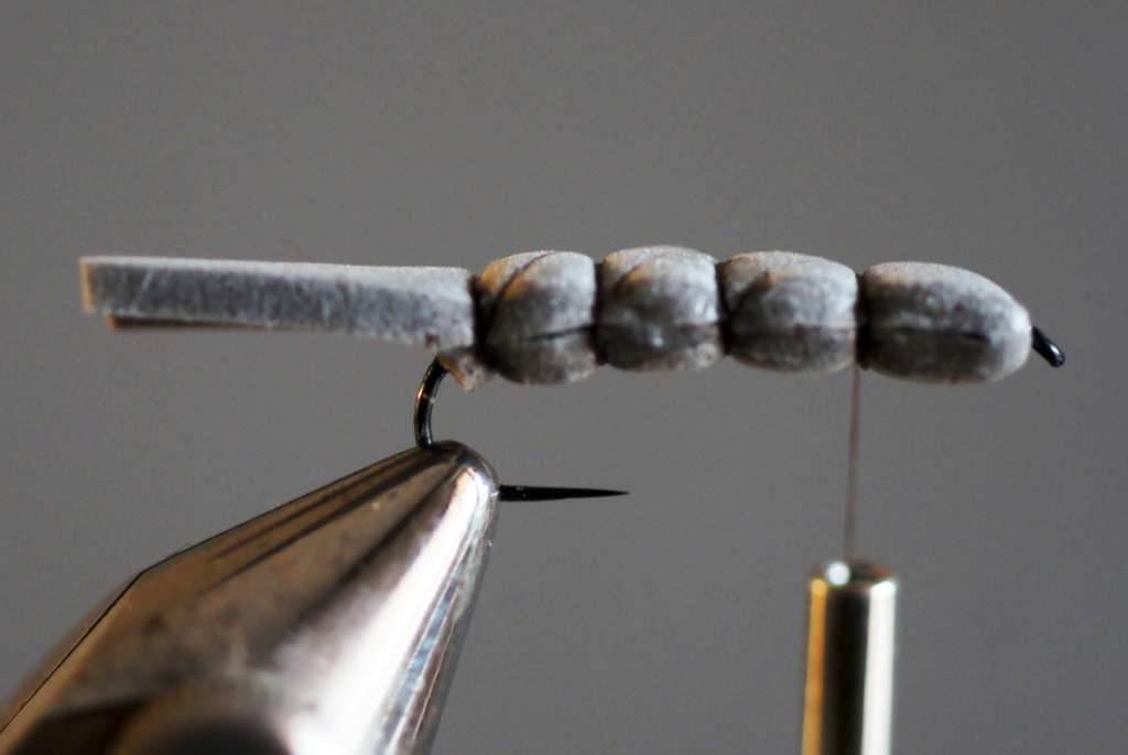 Con giri successivi del filo di montaggio formare tre segmenti (il rimanente sarà la testa), passando sempre sopra al dorso col filo di montaggio prima di eseguire la “pallina” successiva