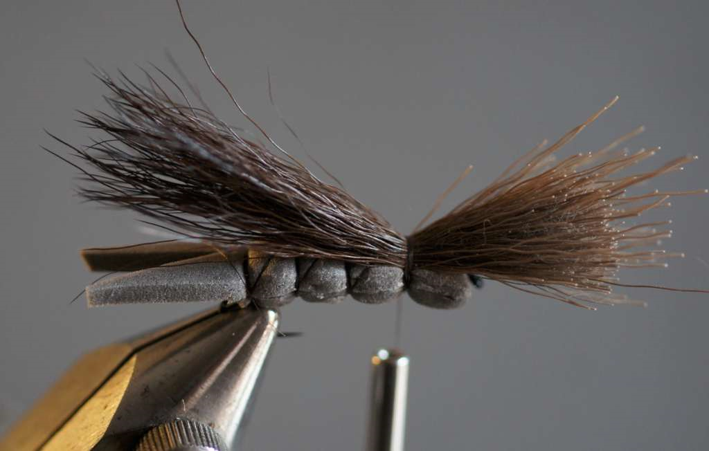 Tagliare, pulire e pareggiare un mazzetto di peli del daino e fissarli sopra al dorso all’altezza dell’ultimo segmento