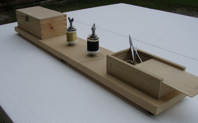 Dopo aver assemblato un po’ di canne ed essermi rotto le scatole di avere sempre i fili di montaggio ingarbugliati fra loro, soprattutto quando si fanno legature a due colori, mi sono costruito questa postazione per le legature e la trovo veramente utile.