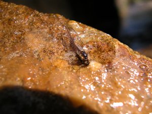Un’idea inizia a germogliare nei miei PAM-neuroni. Scruto il torrente e vedo altri sassi semiaffioranti in una corrente profonda una ventina di centimetri. Mi metto a girarli uno dopo l’altro. La sorpresa si conferma: è pieno di immagini di Baetis. Questa ha le ali un po’ scassate, forse sono io il colpevole quando ho sollevato il sasso.