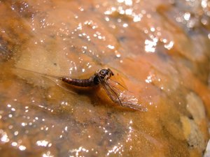 Si tratta di un esemplare dai colori splendidi, le ali sono piegate sul dorso. Scatto la fotografia senza esitare (gli insetti acquatici scappano via in pochissimi secondi, per fare foto di insetti tengo la macchina fotografica già regolata e pronta allo scatto nella mano destra e soltanto dopo sollevo il sasso con la sinistra, lo scatto parte d’intuito, come viene viene).