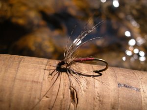 Apro la scatola delle sommerse e scelgo una classica “partridge&red”. Mosca semplicissima che però mi ha regalato momenti di grandissima soddisfazione. Quel giro di mezza (sic!) piuma di pernice vibra nell’acqua come se fosse un essere vivente o morente, mentre il corpicino di filo rosso aggiunge un tocco impressionistico molto suggestivo. Quanto basta per imitare le femmine di Baetis allo sbando dopo l’ovodeposizione. A questi due ingredienti classici personalmente aggiungo solo un piccolo torace in lepre grazie al quale la pernice non va ad incollarsi all’addome quando si bagna. Opinabile, anche perché il dressing classico non lo prevede.
