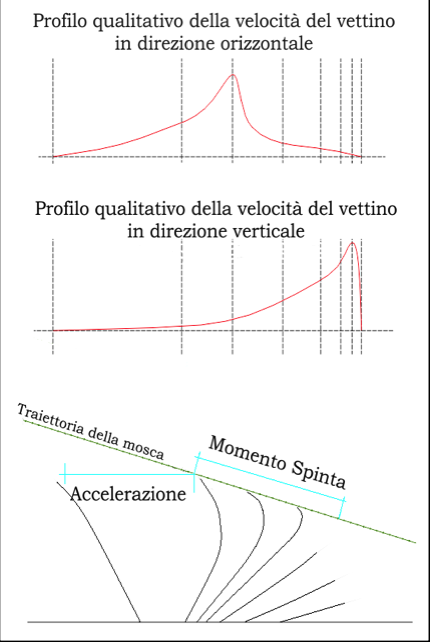 Nell’immagine qui di lato si è cercato di riportare in maniera qualitativa il profilo delle velocità del vettino in direzione orizzontale in direzione verticale (il vettino viaggia verso il basso per cui più è alta la velocità in direzione verticale e più il vettino sta scendendo).