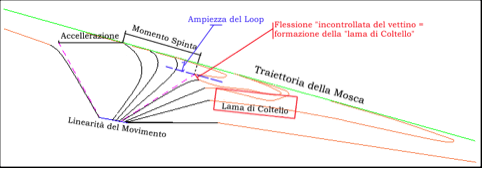 Arriviamo, dunque, al “momento spinta”. Abbiamo detto che il momento spinta è quel gesto necessario a fornire alla coda un impulso, ovvero un incremento repentino di accelerazione che deve terminare nell’istante stesso in cui viene dato (ciò sarebbe un paradosso fisicamente impossibile, ma che vuole rendere l’idea di come eseguire il gesto). Durante questo brevissimo lasso di tempo in cui forniamo ulteriore accelerazione, grazie al momento spinta, otteniamo come risultato quello di incrementare notevolmente la velocità della coda, di conseguenza, non appena il momento spinta esaurisce la sua azione, l’apicale della canna rallenta e la coda, che è diventata più veloce dell’apicale, inizia a sorpassare la canna. Da questo momento inizia la formazione del “Loop”. La “durata” del momento spinta determina anche l’ampiezza del loop, più il momento spinta è impulsivo e più si formerà un loop stretto e a forma di cuspide.