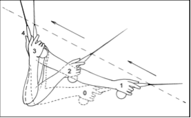 figura 5. Lancio indietro (back cast). A partire dalla posizione 0 (ipotetica posizione di pesca) dovremo seguire con le posizioni 1 – 2 – 3 la linea retta riportata in figura. Da notare il movimento del gomito e, posizione 4, del polso che “accompagnano” l’azione.