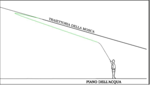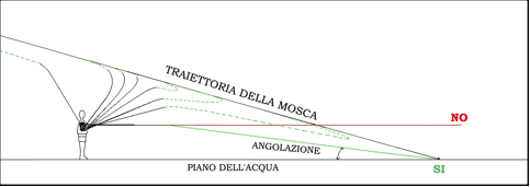 Attraverso un movimento lineare, espresso nella direzione del punto in cui si vuole che la mosca si posi, è possibile ottenere l’angolazione e la precisione desiderati (analizzeremo nel seguito quale punto del sistema “braccio-mano-canna” deve esprimere una traiettoria perfettamente lineare e direzionale)