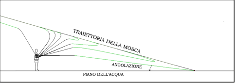 Da ciò scaturisce che il nostro lancio dovrà essere necessariamente indirizzato con una direzione che, a partire dalla vetta della canna (che alla fine dell’azione di lancio dovrà risultare parallela al piano dell’acqua), avrà la direzione verso il punto in cui vogliamo che la mosca si posi. Immaginando di congiungere con una linea retta il punto in cui desideriamo posare la mosca, con la vetta della canna otteniamo l’angolo del lancio. Anticipiamo che la linea immaginaria che congiunge l’apicale della canna e la mosca nel momento di toccare l’acqua rappresenta esattamente la configurazione che la coda e il finale devono avere alla fine del lancio e un istante prima che cominci la vera e propria azione di pesca.